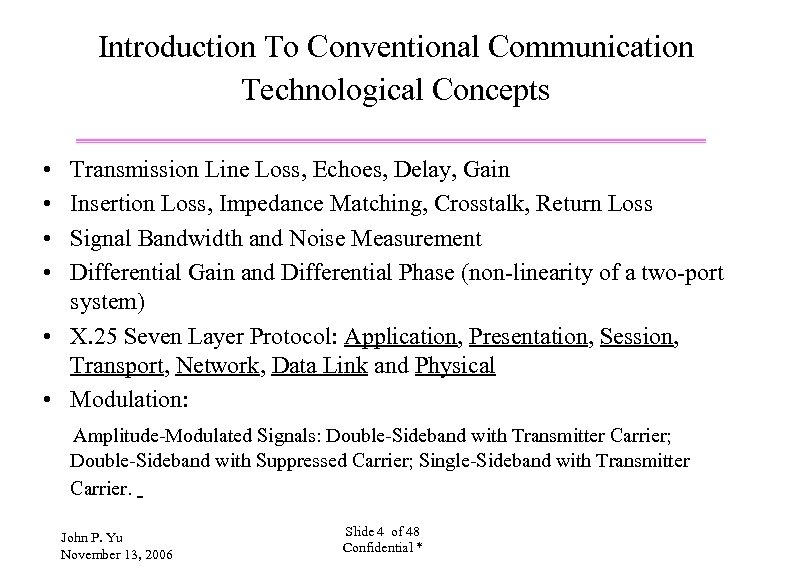 Introduction To Conventional Communication Technological Concepts • • Transmission Line Loss, Echoes, Delay, Gain Insertion Loss, Impedance Matching, Crosstalk, Return Loss Signal Bandwidth and Noise Measurement Differential Gain and Differential Phase (non-linearity of a two-port system) • X. 25 Seven Layer Protocol: Application, Presentation, Session, Transport, Network, Data Link and Physical • Modulation: Amplitude-Modulated Signals: Double-Sideband with Transmitter Carrier; Double-Sideband with Suppressed Carrier; Single-Sideband with Transmitter Carrier. John P. Yu November 13, 2006 Slide 4 of 48 Confidential *