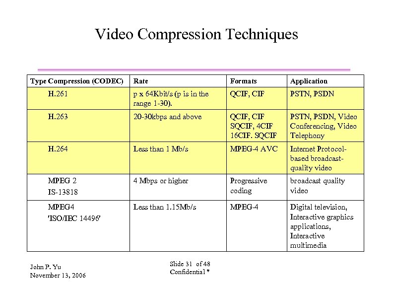 Video Compression Techniques Type Compression (CODEC) Rate Formats Application H. 261 p x 64 Kbit/s (p is in the range 1 -30). QCIF, CIF PSTN, PSDN H. 263 20 -30 kbps and above QCIF, CIF SQCIF, 4 CIF 16 CIF. SQCIF PSTN, PSDN, Video Conferencing, Video Telephony H. 264 Less than 1 Mb/s MPEG-4 AVC Internet Protocolbased broadcastquality video MPEG 2 IS-13818 4 Mbps or higher Progressive coding broadcast quality video MPEG 4 'ISO/IEC 14496' Less than 1. 15 Mb/s MPEG-4 Digital television, Interactive graphics applications, Interactive multimedia John P. Yu November 13, 2006 Slide 31 of 48 Confidential *