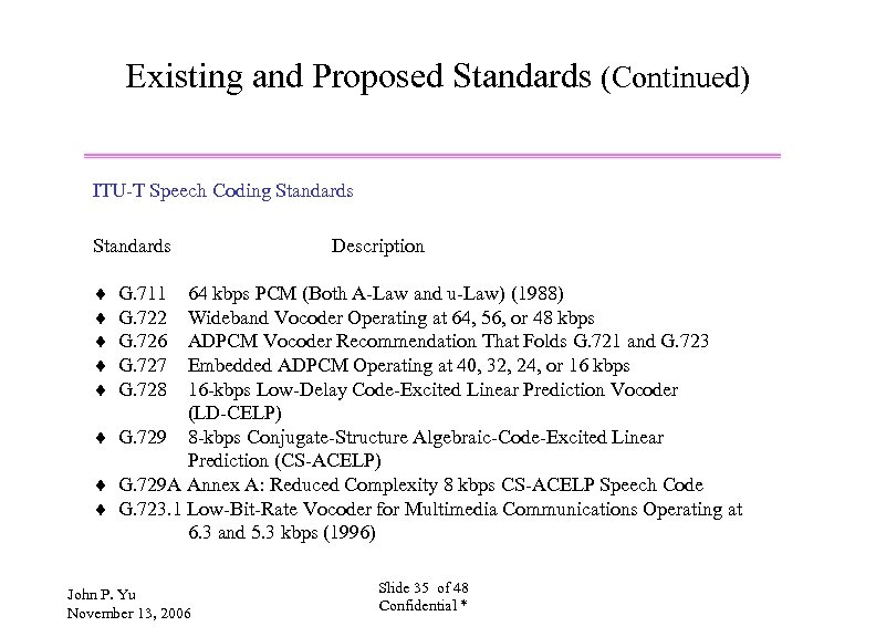 Existing and Proposed Standards (Continued) ITU-T Speech Coding Standards ¨ ¨ ¨ Description G. 711 G. 722 G. 726 G. 727 G. 728 64 kbps PCM (Both A-Law and u-Law) (1988) Wideband Vocoder Operating at 64, 56, or 48 kbps ADPCM Vocoder Recommendation That Folds G. 721 and G. 723 Embedded ADPCM Operating at 40, 32, 24, or 16 kbps 16 -kbps Low-Delay Code-Excited Linear Prediction Vocoder (LD-CELP) ¨ G. 729 8 -kbps Conjugate-Structure Algebraic-Code-Excited Linear Prediction (CS-ACELP) ¨ G. 729 A Annex A: Reduced Complexity 8 kbps CS-ACELP Speech Code ¨ G. 723. 1 Low-Bit-Rate Vocoder for Multimedia Communications Operating at 6. 3 and 5. 3 kbps (1996) John P. Yu November 13, 2006 Slide 35 of 48 Confidential *