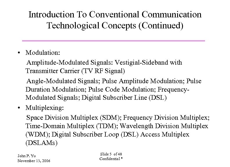Introduction To Conventional Communication Technological Concepts (Continued) • Modulation: Amplitude-Modulated Signals: Vestigial-Sideband with Transmitter Carrier (TV RF Signal) Angle-Modulated Signals; Pulse Amplitude Modulation; Pulse Duration Modulation; Pulse Code Modulation; Frequency. Modulated Signals; Digital Subscriber Line (DSL) • Multiplexing: Space Division Multiplex (SDM); Frequency Division Multiplex; Time-Domain Multiplex (TDM); Wavelength Division Multiplex (WDM); Digital Subscriber Loop (DSL) Access Multiplex (DSLAMs) John P. Yu November 13, 2006 Slide 5 of 48 Confidential *