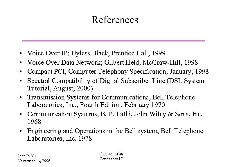 References • • Voice Over IP; Uyless Black, Prentice Hall, 1999 Voice Over Data Network; Gilbert Held, Mc. Graw-Hill, 1998 Compact PCI, Computer Telephony Specification, January, 1998 Spectral Compatibility of Digital Subscriber Line (DSL System Tutorial, August, 2000) • Transmission Systems for Communications, Bell Telephone Laboratories, Inc. , Fourth Edition, February 1970 • Communication Systems, B. P. Lathi, John Wiley & Sons, Inc. 1968 • Engineering and Operations in the Bell system, Bell Telephone Laboratories, Inc. 1978 John P. Yu November 13, 2006 Slide 46 of 48 Confidential *