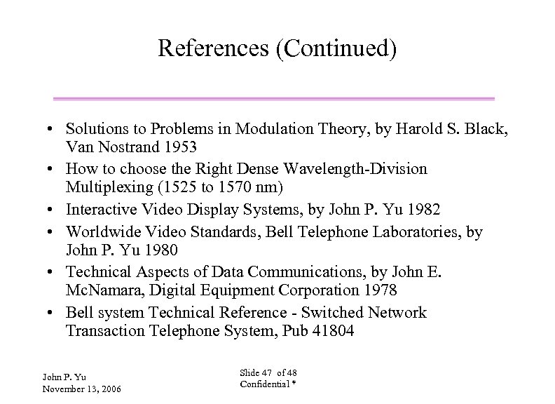 References (Continued) • Solutions to Problems in Modulation Theory, by Harold S. Black, Van Nostrand 1953 • How to choose the Right Dense Wavelength-Division Multiplexing (1525 to 1570 nm) • Interactive Video Display Systems, by John P. Yu 1982 • Worldwide Video Standards, Bell Telephone Laboratories, by John P. Yu 1980 • Technical Aspects of Data Communications, by John E. Mc. Namara, Digital Equipment Corporation 1978 • Bell system Technical Reference - Switched Network Transaction Telephone System, Pub 41804 John P. Yu November 13, 2006 Slide 47 of 48 Confidential *