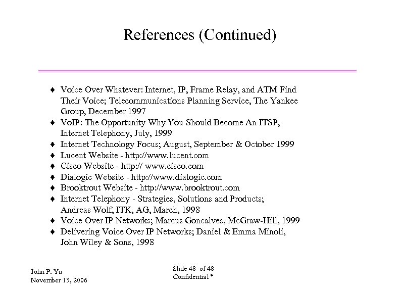 References (Continued) ¨ Voice Over Whatever: Internet, IP, Frame Relay, and ATM Find Their Voice; Telecommunications Planning Service, The Yankee Group, December 1997 ¨ Vo. IP: The Opportunity Why You Should Become An ITSP, Internet Telephony, July, 1999 ¨ Internet Technology Focus; August, September & October 1999 ¨ Lucent Website - http: //www. lucent. com ¨ Cisco Website - http: // www. cisco. com ¨ Dialogic Website - http: //www. dialogic. com ¨ Brooktrout Website - http: //www. brooktrout. com ¨ Internet Telephony - Strategies, Solutions and Products; Andreas Wolf, ITK, AG, March, 1998 ¨ Voice Over IP Networks; Marcus Goncalves, Mc. Graw-Hill, 1999 ¨ Delivering Voice Over IP Networks; Daniel & Emma Minoli, John Wiley & Sons, 1998 John P. Yu November 13, 2006 Slide 48 of 48 Confidential *