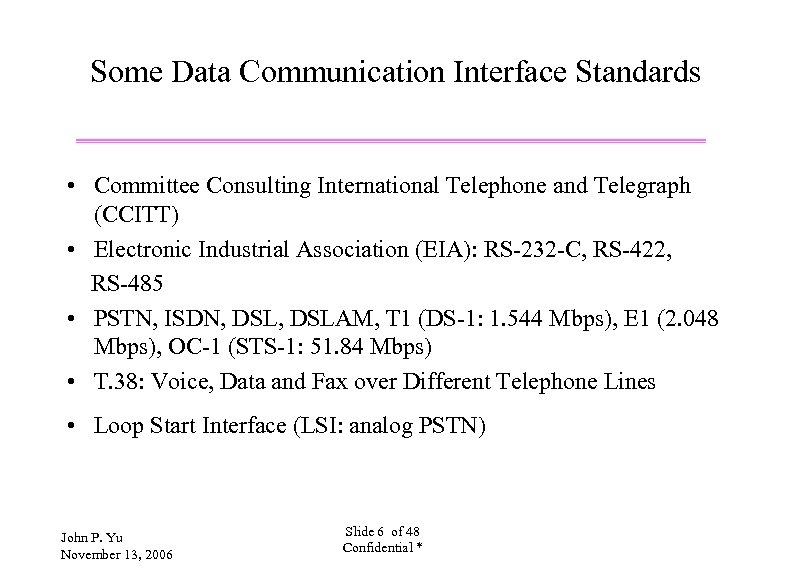 Some Data Communication Interface Standards • Committee Consulting International Telephone and Telegraph (CCITT) • Electronic Industrial Association (EIA): RS-232 -C, RS-422, RS-485 • PSTN, ISDN, DSLAM, T 1 (DS-1: 1. 544 Mbps), E 1 (2. 048 Mbps), OC-1 (STS-1: 51. 84 Mbps) • T. 38: Voice, Data and Fax over Different Telephone Lines • Loop Start Interface (LSI: analog PSTN) John P. Yu November 13, 2006 Slide 6 of 48 Confidential *
