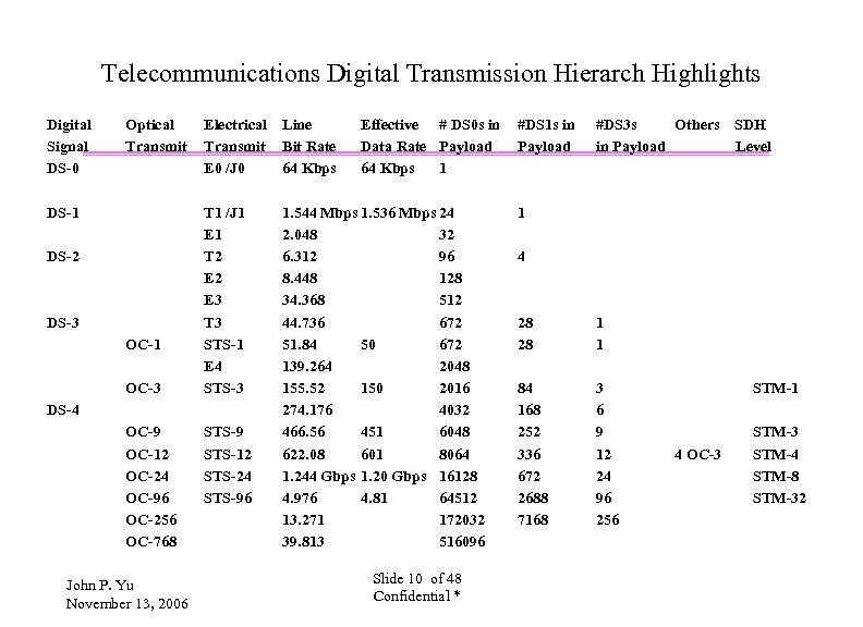 Telecommunications Digital Transmission Hierarch Highlights Digital Signal DS-0 Optical Transmit DS-1 DS-2 DS-3 OC-1 OC-3 Electrical Transmit E 0 /J 0 Line Bit Rate 64 Kbps T 1 /J 1 E 1 T 2 E 3 T 3 STS-1 E 4 STS-3 1. 544 Mbps 1. 536 Mbps 24 2. 048 32 6. 312 96 8. 448 128 34. 368 512 44. 736 672 51. 84 50 672 139. 264 2048 155. 52 150 2016 274. 176 4032 466. 56 451 6048 622. 08 601 8064 1. 244 Gbps 1. 20 Gbps 16128 4. 976 4. 81 64512 13. 271 172032 39. 813 516096 DS-4 OC-9 OC-12 OC-24 OC-96 OC-256 OC-768 John P. Yu November 13, 2006 STS-9 STS-12 STS-24 STS-96 Effective # DS 0 s in Data Rate Payload 64 Kbps 1 Slide 10 of 48 Confidential * #DS 1 s in Payload #DS 3 s Others in Payload SDH Level 1 4 28 28 1 1 84 168 252 336 672 2688 7168 3 6 9 12 24 96 256 STM-1 4 OC-3 STM-4 STM-8 STM-32