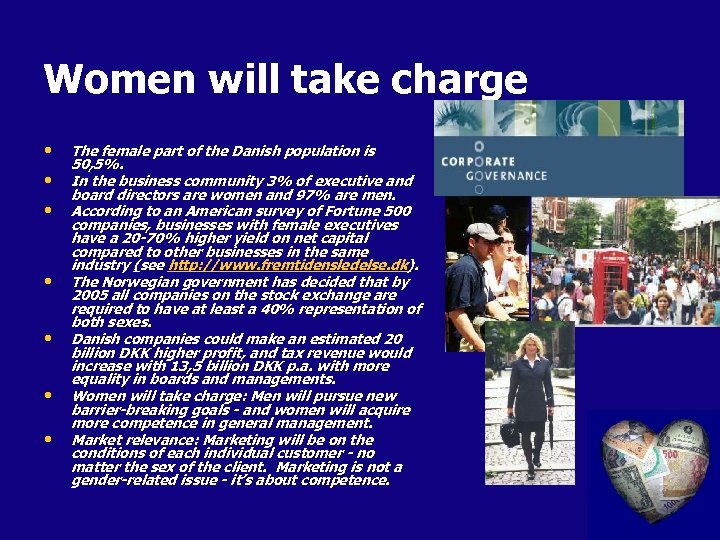 Women will take charge • • The female part of the Danish population is 50, 5%. In the business community 3% of executive and board directors are women and 97% are men. According to an American survey of Fortune 500 companies, businesses with female executives have a 20 -70% higher yield on net capital compared to other businesses in the same industry (see http: //www. fremtidensledelse. dk). The Norwegian government has decided that by 2005 all companies on the stock exchange are required to have at least a 40% representation of both sexes. Danish companies could make an estimated 20 billion DKK higher profit, and tax revenue would increase with 13, 5 billion DKK p. a. with more equality in boards and managements. Women will take charge: Men will pursue new barrier-breaking goals - and women will acquire more competence in general management. Market relevance: Marketing will be on the conditions of each individual customer - no matter the sex of the client. Marketing is not a gender-related issue - it’s about competence.