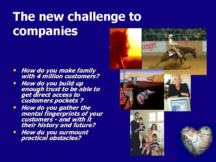 The new challenge to companies • How do you make family • • • with 4 million customers? How do you build up enough trust to be able to get direct access to customers pockets ? How do you gather the mental fingerprints of your customers - and with it their history and future? How du you surmount practical obstacles?