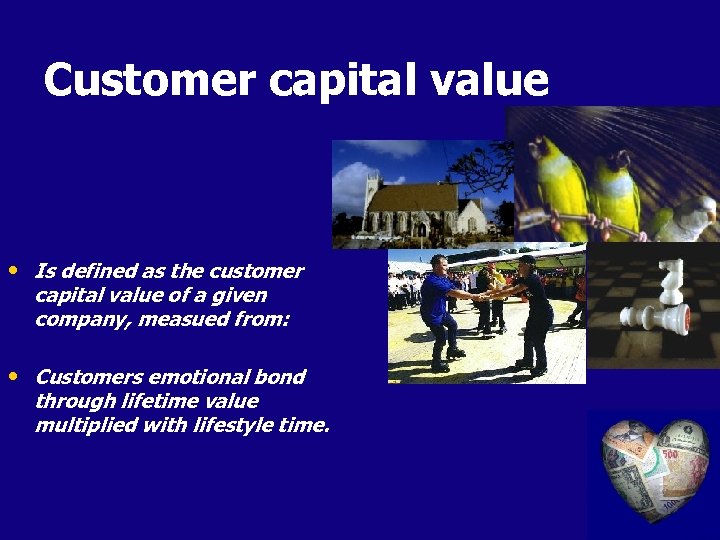 Customer capital value • Is defined as the customer capital value of a given company, measued from: • Customers emotional bond through lifetime value multiplied with lifestyle time.
