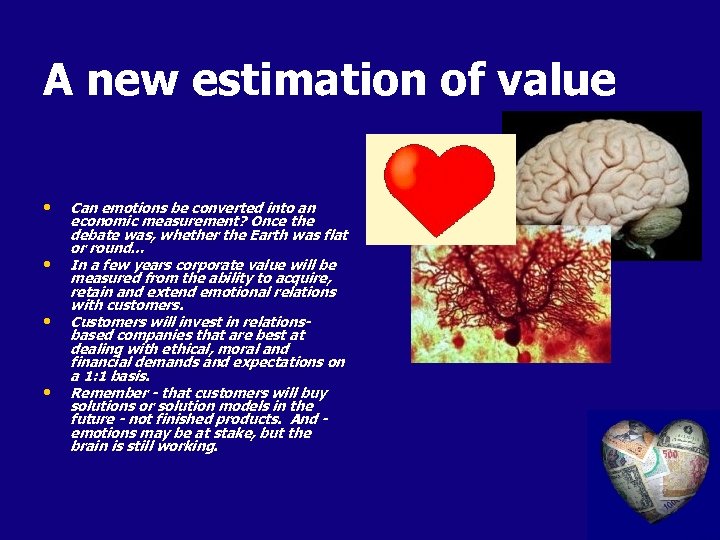A new estimation of value • • Can emotions be converted into an economic measurement? Once the debate was, whether the Earth was flat or round… In a few years corporate value will be measured from the ability to acquire, retain and extend emotional relations with customers. Customers will invest in relationsbased companies that are best at dealing with ethical, moral and financial demands and expectations on a 1: 1 basis. Remember - that customers will buy solutions or solution models in the future - not finished products. And emotions may be at stake, but the brain is still working.