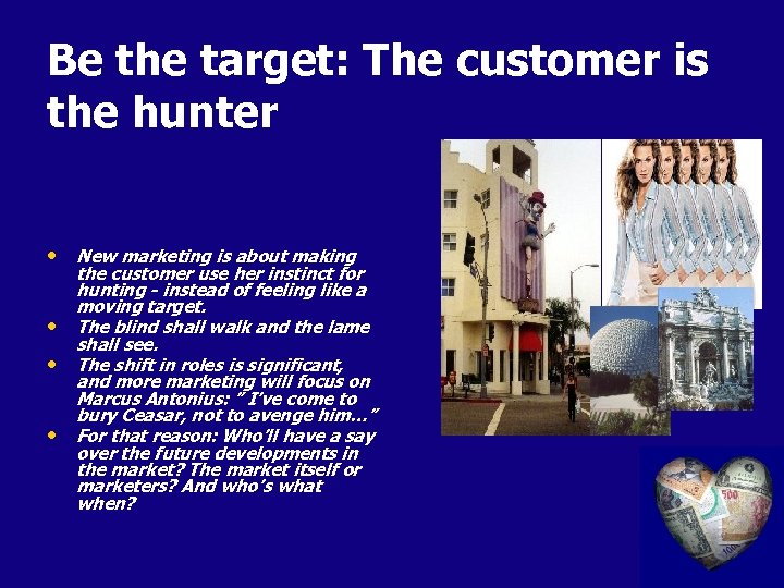 Be the target: The customer is the hunter • New marketing is about making • • • the customer use her instinct for hunting - instead of feeling like a moving target. The blind shall walk and the lame shall see. The shift in roles is significant, and more marketing will focus on Marcus Antonius: ” I’ve come to bury Ceasar, not to avenge him…” For that reason: Who’ll have a say over the future developments in the market? The market itself or marketers? And who’s what when?