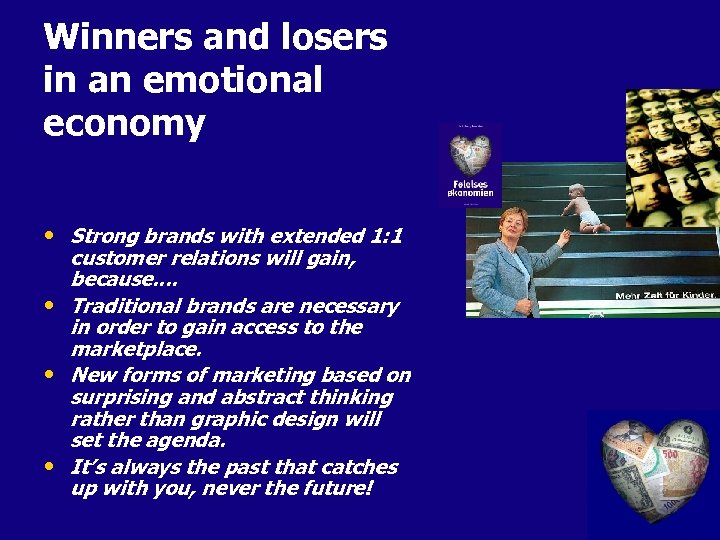 Winners and losers in an emotional economy • Strong brands with extended 1: 1 customer relations will gain, because. . • Traditional brands are necessary in order to gain access to the marketplace. • New forms of marketing based on surprising and abstract thinking rather than graphic design will set the agenda. • It’s always the past that catches up with you, never the future!