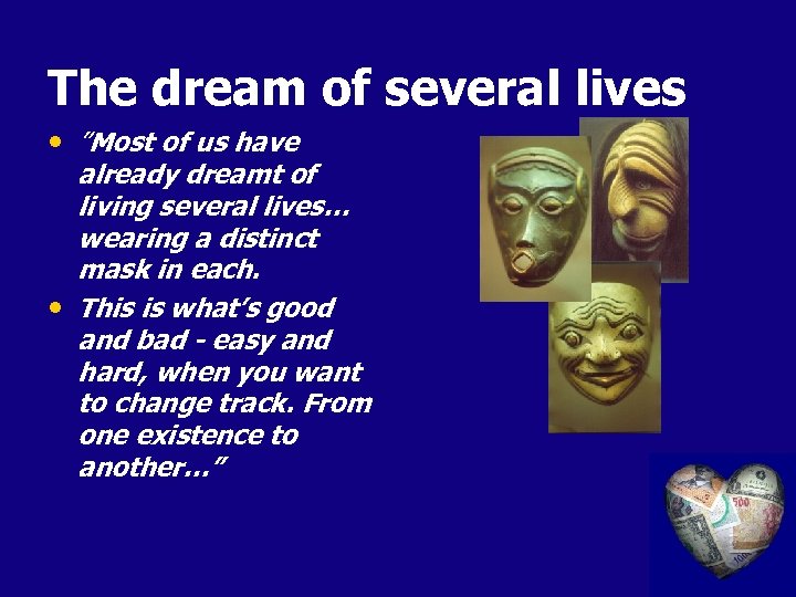 The dream of several lives • ”Most of us have already dreamt of living several lives… wearing a distinct mask in each. • This is what’s good and bad - easy and hard, when you want to change track. From one existence to another…”