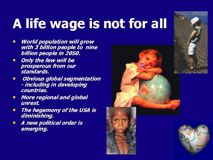 A life wage is not for all • World population will grow • • • with 3 billion people to nine billion people in 2050. Only the few will be prosperous from our standards. Obvious global segmentation - including in developing countries. More regional and global unrest. The hegemony of the USA is diminishing. A new political order is emerging.