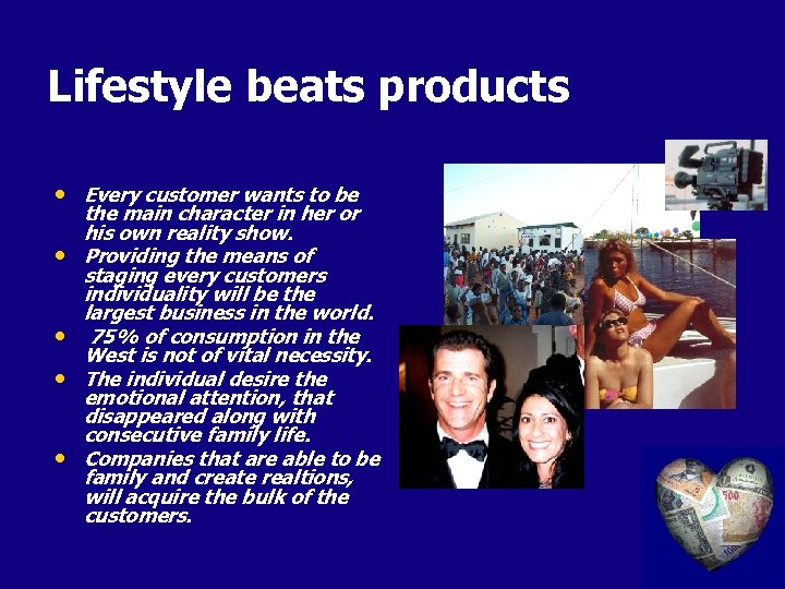 Lifestyle beats products • Every customer wants to be • • the main character in her or his own reality show. Providing the means of staging every customers individuality will be the largest business in the world. 75% of consumption in the West is not of vital necessity. The individual desire the emotional attention, that disappeared along with consecutive family life. Companies that are able to be family and create realtions, will acquire the bulk of the customers.