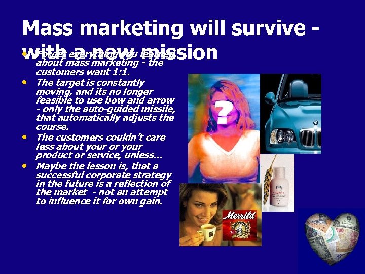 Mass marketing will survive • Forget everything you learned withmass marketing mission a new - the about customers want 1: 1. • The target is constantly moving, and its no longer feasible to use bow and arrow - only the auto-guided missile, that automatically adjusts the course. • The customers couldn’t care less about your or your product or service, unless… • Maybe the lesson is, that a successful corporate strategy in the future is a reflection of the market - not an attempt to influence it for own gain.