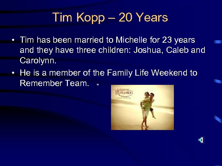Tim Kopp – 20 Years • Tim has been married to Michelle for 23 years and they have three children: Joshua, Caleb and Carolynn. • He is a member of the Family Life Weekend to Remember Team. *
