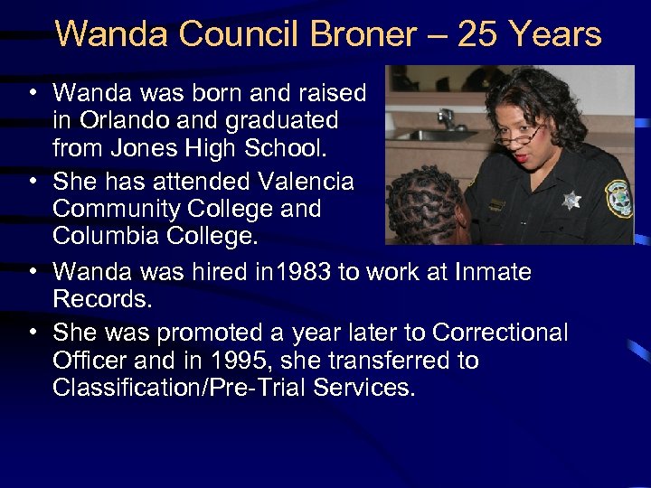 Wanda Council Broner – 25 Years • Wanda was born and raised in Orlando and graduated from Jones High School. • She has attended Valencia Community College and Columbia College. • Wanda was hired in 1983 to work at Inmate Records. • She was promoted a year later to Correctional Officer and in 1995, she transferred to Classification/Pre-Trial Services.