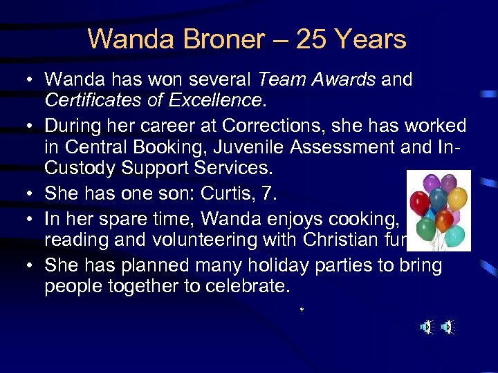 Wanda Broner – 25 Years • Wanda has won several Team Awards and Certificates of Excellence. • During her career at Corrections, she has worked in Central Booking, Juvenile Assessment and In. Custody Support Services. • She has one son: Curtis, 7. • In her spare time, Wanda enjoys cooking, reading and volunteering with Christian functions. • She has planned many holiday parties to bring people together to celebrate. *