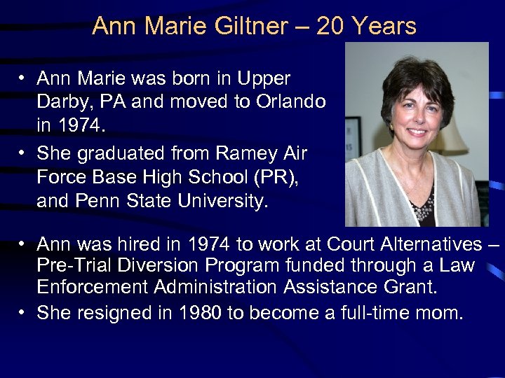 Ann Marie Giltner – 20 Years • Ann Marie was born in Upper Darby, PA and moved to Orlando in 1974. • She graduated from Ramey Air Force Base High School (PR), and Penn State University. • Ann was hired in 1974 to work at Court Alternatives – Pre-Trial Diversion Program funded through a Law Enforcement Administration Assistance Grant. • She resigned in 1980 to become a full-time mom.