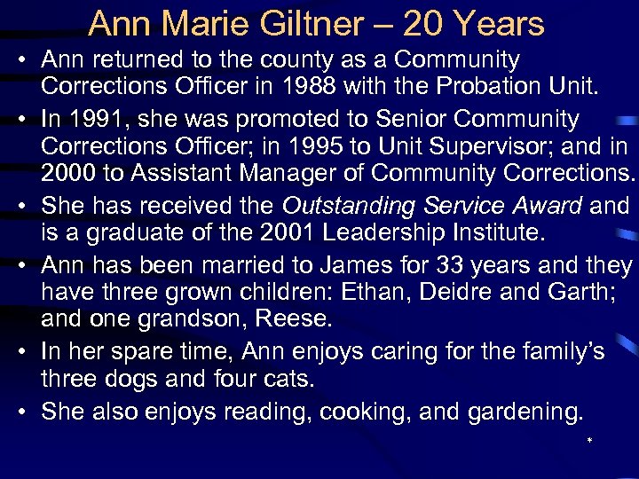 Ann Marie Giltner – 20 Years • Ann returned to the county as a Community Corrections Officer in 1988 with the Probation Unit. • In 1991, she was promoted to Senior Community Corrections Officer; in 1995 to Unit Supervisor; and in 2000 to Assistant Manager of Community Corrections. • She has received the Outstanding Service Award and is a graduate of the 2001 Leadership Institute. • Ann has been married to James for 33 years and they have three grown children: Ethan, Deidre and Garth; and one grandson, Reese. • In her spare time, Ann enjoys caring for the family’s three dogs and four cats. • She also enjoys reading, cooking, and gardening. *