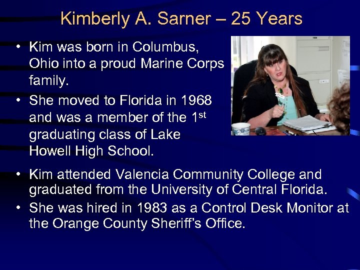 Kimberly A. Sarner – 25 Years • Kim was born in Columbus, Ohio into a proud Marine Corps family. • She moved to Florida in 1968 and was a member of the 1 st graduating class of Lake Howell High School. • Kim attended Valencia Community College and graduated from the University of Central Florida. • She was hired in 1983 as a Control Desk Monitor at the Orange County Sheriff’s Office.