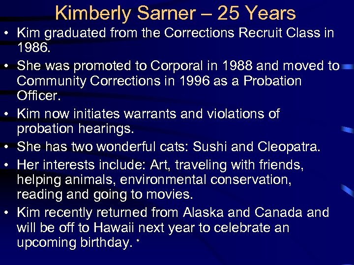 Kimberly Sarner – 25 Years • Kim graduated from the Corrections Recruit Class in 1986. • She was promoted to Corporal in 1988 and moved to Community Corrections in 1996 as a Probation Officer. • Kim now initiates warrants and violations of probation hearings. • She has two wonderful cats: Sushi and Cleopatra. • Her interests include: Art, traveling with friends, helping animals, environmental conservation, reading and going to movies. • Kim recently returned from Alaska and Canada and will be off to Hawaii next year to celebrate an upcoming birthday. *