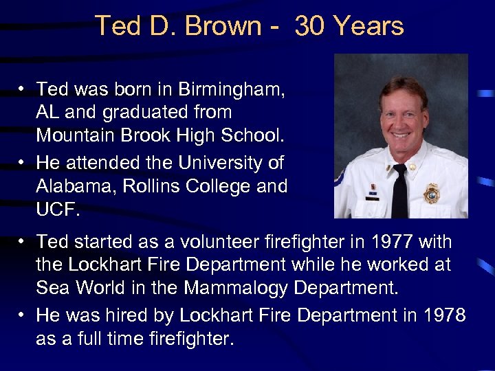 Ted D. Brown - 30 Years • Ted was born in Birmingham, AL and graduated from Mountain Brook High School. • He attended the University of Alabama, Rollins College and UCF. • Ted started as a volunteer firefighter in 1977 with the Lockhart Fire Department while he worked at Sea World in the Mammalogy Department. • He was hired by Lockhart Fire Department in 1978 as a full time firefighter.