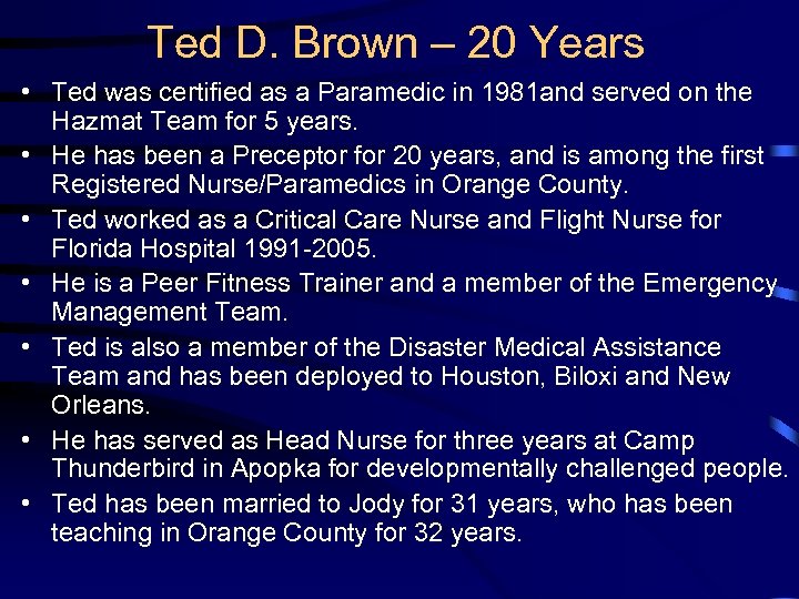Ted D. Brown – 20 Years • Ted was certified as a Paramedic in 1981 and served on the Hazmat Team for 5 years. • He has been a Preceptor for 20 years, and is among the first Registered Nurse/Paramedics in Orange County. • Ted worked as a Critical Care Nurse and Flight Nurse for Florida Hospital 1991 -2005. • He is a Peer Fitness Trainer and a member of the Emergency Management Team. • Ted is also a member of the Disaster Medical Assistance Team and has been deployed to Houston, Biloxi and New Orleans. • He has served as Head Nurse for three years at Camp Thunderbird in Apopka for developmentally challenged people. • Ted has been married to Jody for 31 years, who has been teaching in Orange County for 32 years.