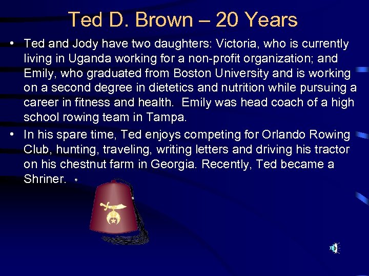 Ted D. Brown – 20 Years • Ted and Jody have two daughters: Victoria, who is currently living in Uganda working for a non-profit organization; and Emily, who graduated from Boston University and is working on a second degree in dietetics and nutrition while pursuing a career in fitness and health. Emily was head coach of a high school rowing team in Tampa. • In his spare time, Ted enjoys competing for Orlando Rowing Club, hunting, traveling, writing letters and driving his tractor on his chestnut farm in Georgia. Recently, Ted became a Shriner. *
