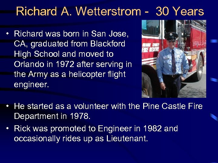 Richard A. Wetterstrom - 30 Years • Richard was born in San Jose, CA, graduated from Blackford High School and moved to Orlando in 1972 after serving in the Army as a helicopter flight engineer. • He started as a volunteer with the Pine Castle Fire Department in 1978. • Rick was promoted to Engineer in 1982 and occasionally rides up as Lieutenant.
