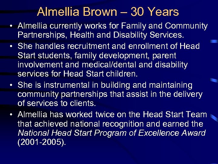 Almellia Brown – 30 Years • Almellia currently works for Family and Community Partnerships, Health and Disability Services. • She handles recruitment and enrollment of Head Start students, family development, parent involvement and medical/dental and disability services for Head Start children. • She is instrumental in building and maintaining community partnerships that assist in the delivery of services to clients. • Almellia has worked twice on the Head Start Team that achieved national recognition and earned the National Head Start Program of Excellence Award (2001 -2005).