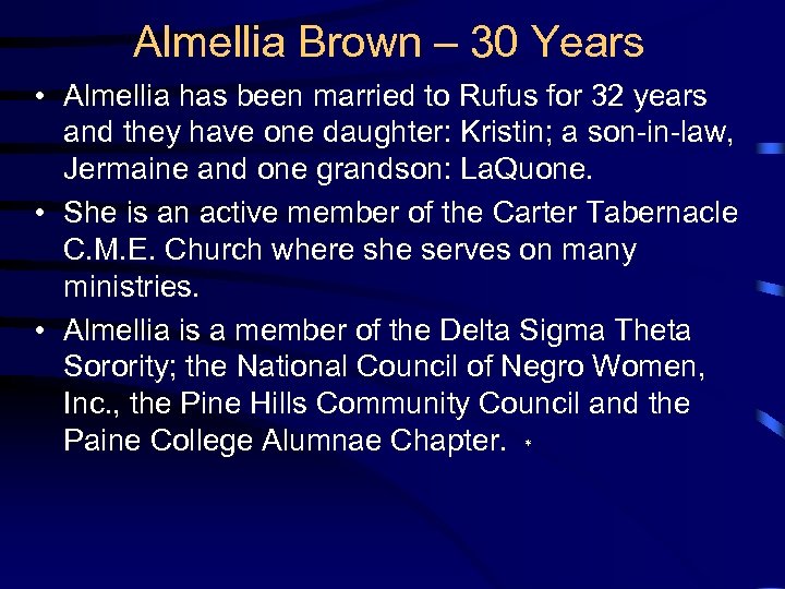 Almellia Brown – 30 Years • Almellia has been married to Rufus for 32 years and they have one daughter: Kristin; a son-in-law, Jermaine and one grandson: La. Quone. • She is an active member of the Carter Tabernacle C. M. E. Church where she serves on many ministries. • Almellia is a member of the Delta Sigma Theta Sorority; the National Council of Negro Women, Inc. , the Pine Hills Community Council and the Paine College Alumnae Chapter. *