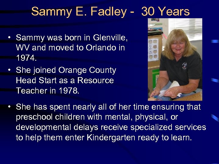 Sammy E. Fadley - 30 Years • Sammy was born in Glenville, WV and moved to Orlando in 1974. • She joined Orange County Head Start as a Resource Teacher in 1978. • She has spent nearly all of her time ensuring that preschool children with mental, physical, or developmental delays receive specialized services to help them enter Kindergarten ready to learn.