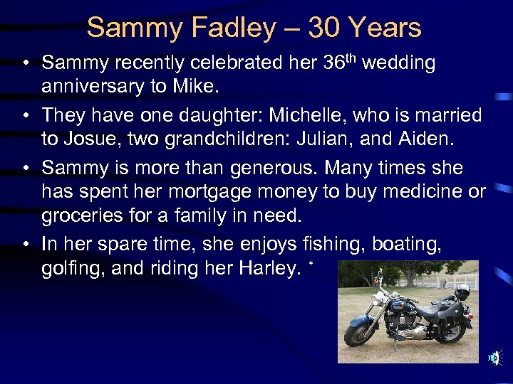 Sammy Fadley – 30 Years • Sammy recently celebrated her 36 th wedding anniversary to Mike. • They have one daughter: Michelle, who is married to Josue, two grandchildren: Julian, and Aiden. • Sammy is more than generous. Many times she has spent her mortgage money to buy medicine or groceries for a family in need. • In her spare time, she enjoys fishing, boating, golfing, and riding her Harley. *