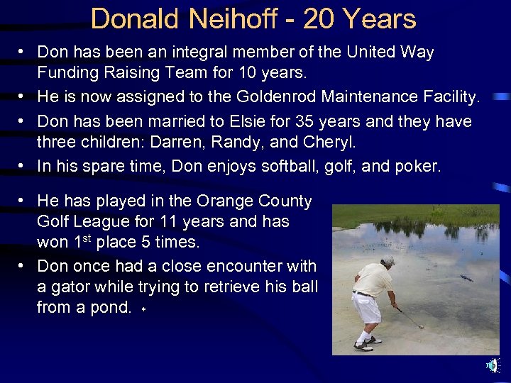 Donald Neihoff - 20 Years • Don has been an integral member of the United Way Funding Raising Team for 10 years. • He is now assigned to the Goldenrod Maintenance Facility. • Don has been married to Elsie for 35 years and they have three children: Darren, Randy, and Cheryl. • In his spare time, Don enjoys softball, golf, and poker. • He has played in the Orange County Golf League for 11 years and has won 1 st place 5 times. • Don once had a close encounter with a gator while trying to retrieve his ball from a pond. *