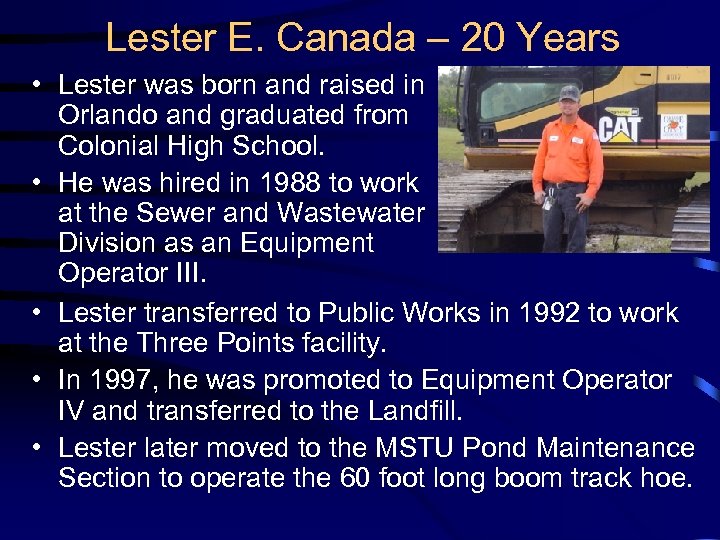Lester E. Canada – 20 Years • Lester was born and raised in Orlando and graduated from Colonial High School. • He was hired in 1988 to work at the Sewer and Wastewater Division as an Equipment Operator III. • Lester transferred to Public Works in 1992 to work at the Three Points facility. • In 1997, he was promoted to Equipment Operator IV and transferred to the Landfill. • Lester later moved to the MSTU Pond Maintenance Section to operate the 60 foot long boom track hoe.