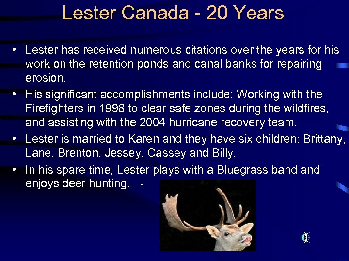 Lester Canada - 20 Years • Lester has received numerous citations over the years for his work on the retention ponds and canal banks for repairing erosion. • His significant accomplishments include: Working with the Firefighters in 1998 to clear safe zones during the wildfires, and assisting with the 2004 hurricane recovery team. • Lester is married to Karen and they have six children: Brittany, Lane, Brenton, Jessey, Cassey and Billy. • In his spare time, Lester plays with a Bluegrass band enjoys deer hunting. *