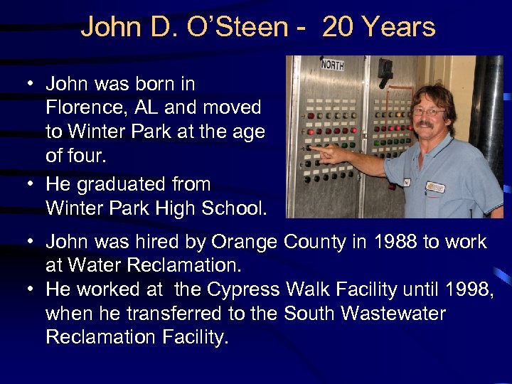 John D. O’Steen - 20 Years • John was born in Florence, AL and moved to Winter Park at the age of four. • He graduated from Winter Park High School. • John was hired by Orange County in 1988 to work at Water Reclamation. • He worked at the Cypress Walk Facility until 1998, when he transferred to the South Wastewater Reclamation Facility.