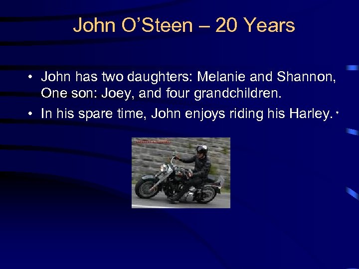 John O’Steen – 20 Years • John has two daughters: Melanie and Shannon, One son: Joey, and four grandchildren. • In his spare time, John enjoys riding his Harley. *