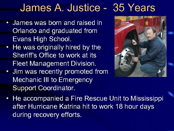 James A. Justice - 35 Years • James was born and raised in Orlando and graduated from Evans High School. • He was originally hired by the Sheriff’s Office to work at its Fleet Management Division. • Jim was recently promoted from Mechanic III to Emergency Support Coordinator. • He accompanied a Fire Rescue Unit to Mississippi after Hurricane Katrina hit to work 18 hour days during recovery efforts.