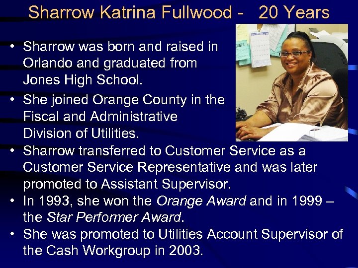 Sharrow Katrina Fullwood - 20 Years • Sharrow was born and raised in Orlando and graduated from Jones High School. • She joined Orange County in the Fiscal and Administrative Division of Utilities. • Sharrow transferred to Customer Service as a Customer Service Representative and was later promoted to Assistant Supervisor. • In 1993, she won the Orange Award and in 1999 – the Star Performer Award. • She was promoted to Utilities Account Supervisor of the Cash Workgroup in 2003.