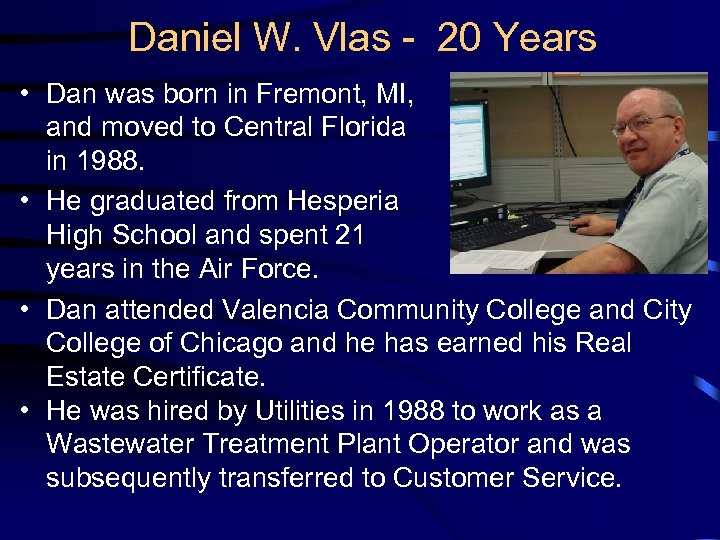 Daniel W. Vlas - 20 Years • Dan was born in Fremont, MI, and moved to Central Florida in 1988. • He graduated from Hesperia High School and spent 21 years in the Air Force. • Dan attended Valencia Community College and City College of Chicago and he has earned his Real Estate Certificate. • He was hired by Utilities in 1988 to work as a Wastewater Treatment Plant Operator and was subsequently transferred to Customer Service.