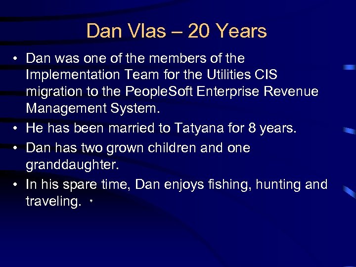 Dan Vlas – 20 Years • Dan was one of the members of the Implementation Team for the Utilities CIS migration to the People. Soft Enterprise Revenue Management System. • He has been married to Tatyana for 8 years. • Dan has two grown children and one granddaughter. • In his spare time, Dan enjoys fishing, hunting and traveling. *