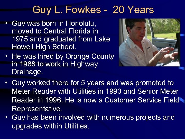 Guy L. Fowkes - 20 Years • Guy was born in Honolulu, moved to Central Florida in 1975 and graduated from Lake Howell High School. • He was hired by Orange County in 1988 to work in Highway Drainage. • Guy worked there for 5 years and was promoted to Meter Reader with Utilities in 1993 and Senior Meter Reader in 1996. He is now a Customer Service Field Representative. • Guy has been involved with numerous projects and upgrades within Utilities.
