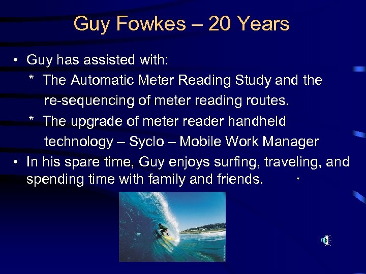 Guy Fowkes – 20 Years • Guy has assisted with: * The Automatic Meter Reading Study and the re-sequencing of meter reading routes. * The upgrade of meter reader handheld technology – Syclo – Mobile Work Manager • In his spare time, Guy enjoys surfing, traveling, and * spending time with family and friends.