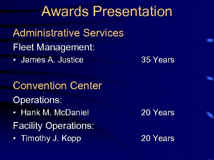 Awards Presentation Administrative Services Fleet Management: • James A. Justice 35 Years Convention Center Operations: • Hank M. Mc. Daniel 20 Years Facility Operations: • Timothy J. Kopp 20 Years