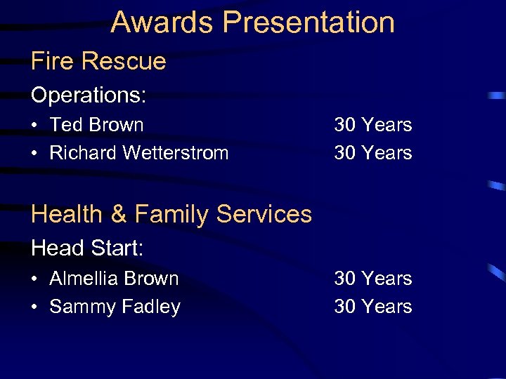 Awards Presentation Fire Rescue Operations: • Ted Brown • Richard Wetterstrom 30 Years Health & Family Services Head Start: • Almellia Brown • Sammy Fadley 30 Years