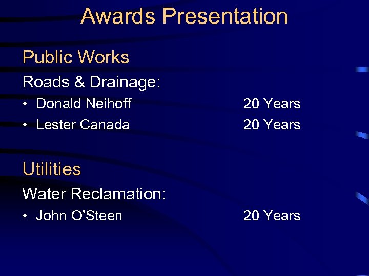 Awards Presentation Public Works Roads & Drainage: • Donald Neihoff • Lester Canada 20 Years Utilities Water Reclamation: • John O’Steen 20 Years