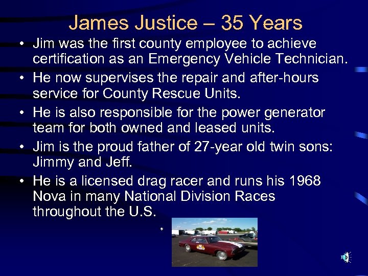 James Justice – 35 Years • Jim was the first county employee to achieve certification as an Emergency Vehicle Technician. • He now supervises the repair and after-hours service for County Rescue Units. • He is also responsible for the power generator team for both owned and leased units. • Jim is the proud father of 27 -year old twin sons: Jimmy and Jeff. • He is a licensed drag racer and runs his 1968 Nova in many National Division Races throughout the U. S. *