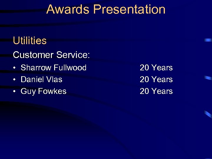 Awards Presentation Utilities Customer Service: • Sharrow Fullwood • Daniel Vlas • Guy Fowkes 20 Years